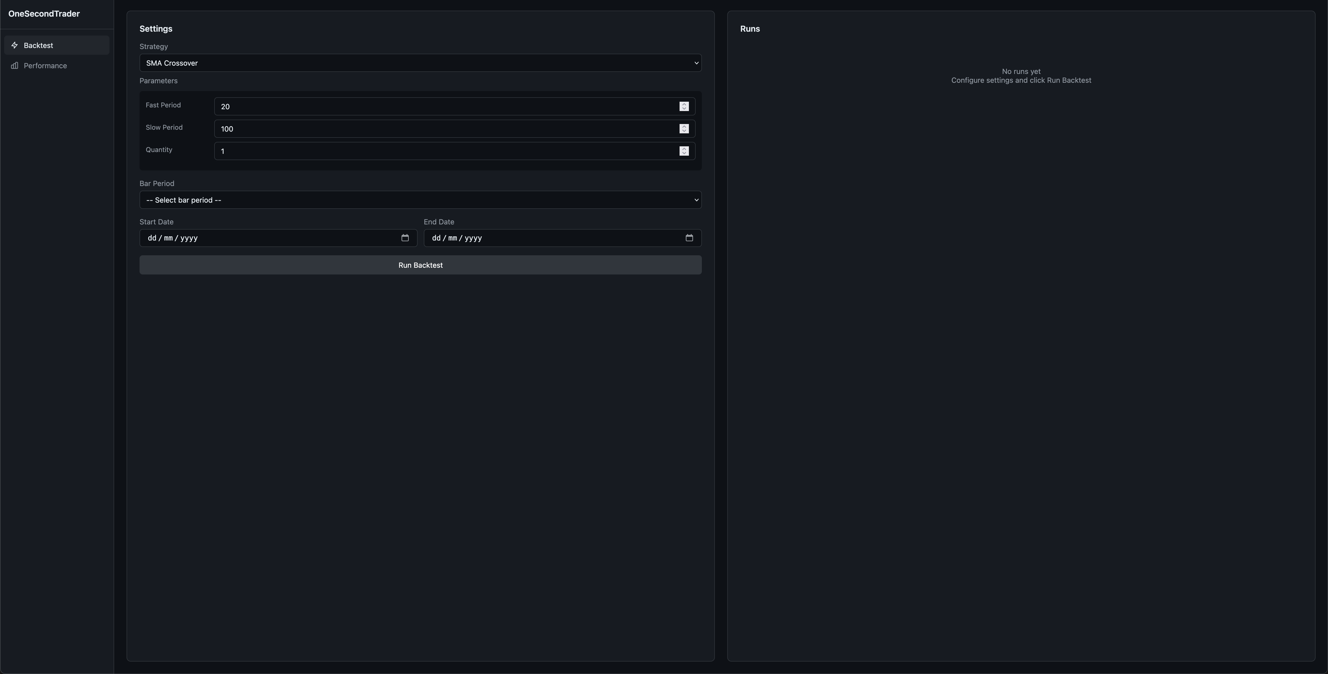 Now it is time to explore the dashboard. It will allow you to run backtests and analyze performance metrics. The OneSecondTrader package provides a simple SMA crossover strategy that you will backtest to acquaint yourself with the dashboard. Afterward, you will learn how to create your own indicators and strategies and backtest them via the dashboard.