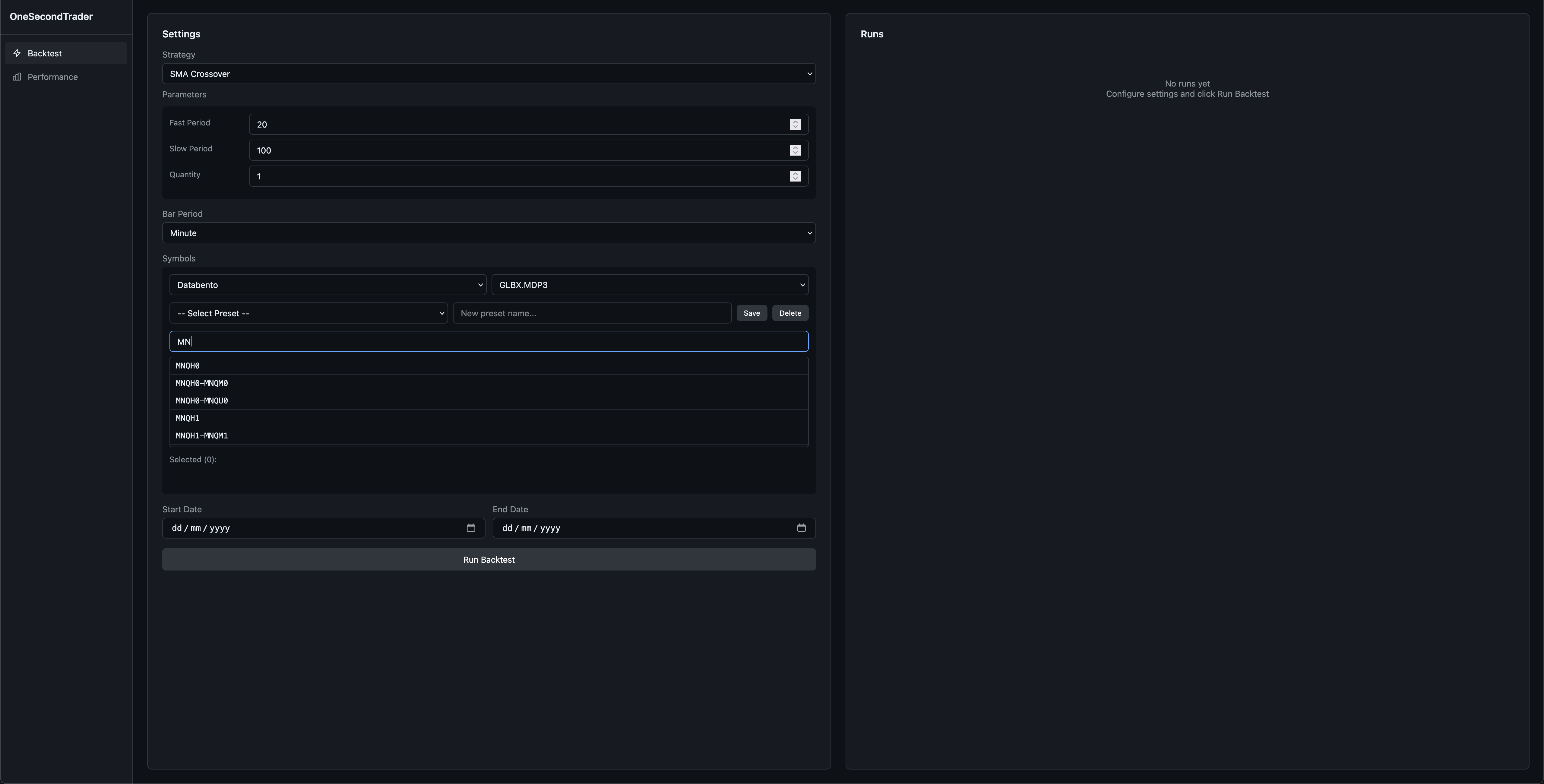 Running backtests requires historical market data. For serious work, we recommend using a data provider like Databento.